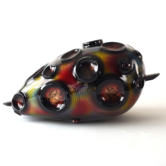 新品タンクをペイントしています。 芯材を円の形に溶接、中心はへこませた後、パテでモールディングしています。 クレーターのイメージで製作しました。 細かめのフレークにカラフルなキャンディ、波紋のような薄ライン入り。 クレーターの中はリーフを貼って模様を入れました。 コックは真ん中あたり右側に3/8NPTが1か所、広報左右に1/4NPTがそれぞれあります。 使わないコック穴はプラグボルトで塞いでください。 【サイズ】 長さ:約360mm(ブラケット含まず) 幅:約220mm 高さ:約190mm トンネル幅:約50mm 深さ(前方部):約90mm 容量:約6.5リットル 内容量表記は目安となっております。 車体にマウント後、実際に使える容量は表記より低くなる場合がございます。